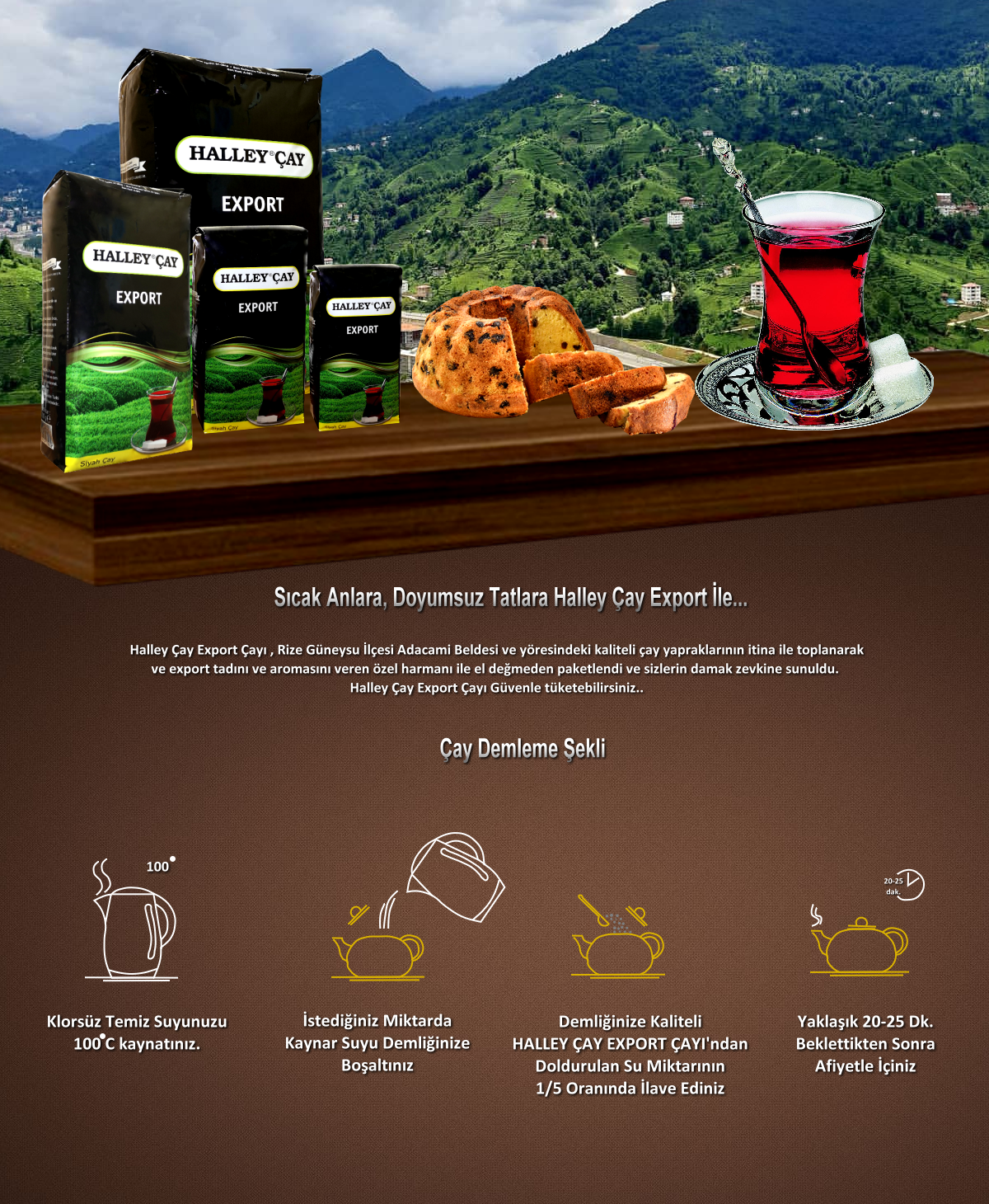 Halley Çay Export Çayı , Rize Güneysu İlçesi Adacami Beldesi ve yöresindeki kaliteli çay yapraklarının itina ile toplanarak