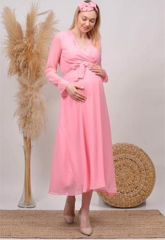 O7053-Kruvaze Şifon Kuşak Baby Shower Maxi Hamile Elbise