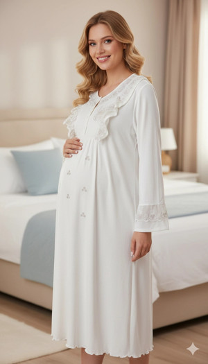 Beyaz Hamile Sabahlık Tunik Gecelik Ikili Takım Likralı