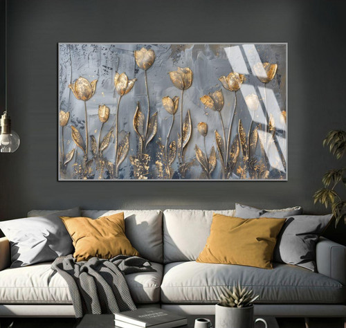 Harikabirev Gri - Gold Çiçekl Detaylar Soyut Modeli Çerçeveli Temperli Cam Tablo Tekli Yatay