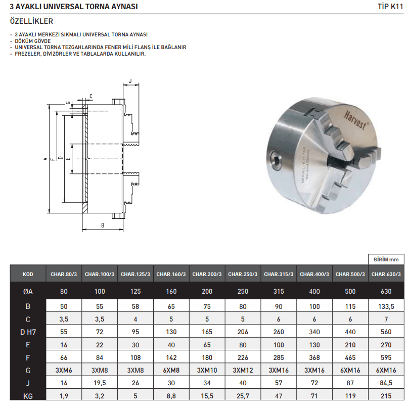 Harvest 80x3 torna aynası, dayanıklı çelik malzemeden üretilmiş olup, uzun ömürlü ve yoğun kullanım koşullarına dayanıklıdır. Ayarlanabilir üç çenesi, çeşitli iş parçalarının güvenli bir şekilde sıkıştırılmasına olanak tanır, bu da çok yönlü bir kullanım sağlar. Çeneler arasındaki hassas hareket ve sağlam kavrama, hem içten hem de dıştan sıkma işlemlerinde üstün performans sunar.