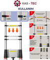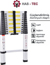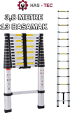 13 basamaklı, 11,2 kg ağırlığındaki alüminyum teleskopik merdiven, 150 kg taşıma kapasitesine sahiptir. Kapalı yükseklik 90 cm, açık yükseklik 3,8 m. Hafif yapısı ve güvenli kilitleme sistemi ile hem profesyonel hem ev tipi kullanım için uygundur. Dayanıklılık, güven ve ergonomi bir arada.