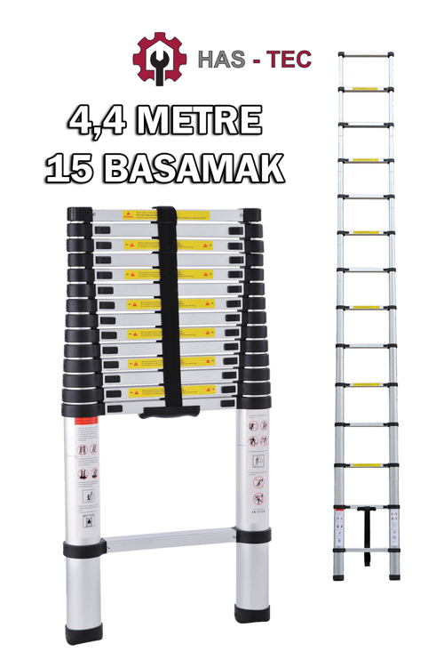 Hafiflik, güvenlik ve dayanıklılığı bir arada sunan Has-Tec 15 basamaklı teleskopik merdiven, ev, ofis, depo ve şantiye kullanımı için ideal bir tercihtir.