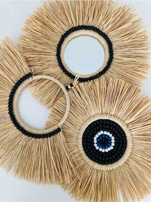 El yapımı rafya ayna seti, her bir parçanın özenle işlenmiş Ahşap materyalden üretilmesi ile dikkat çeker