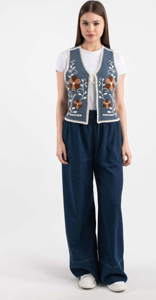 Hatun Atila Hatunatila Çiçek Desenli Akrilik Süzine Yelek İndigo- 5155