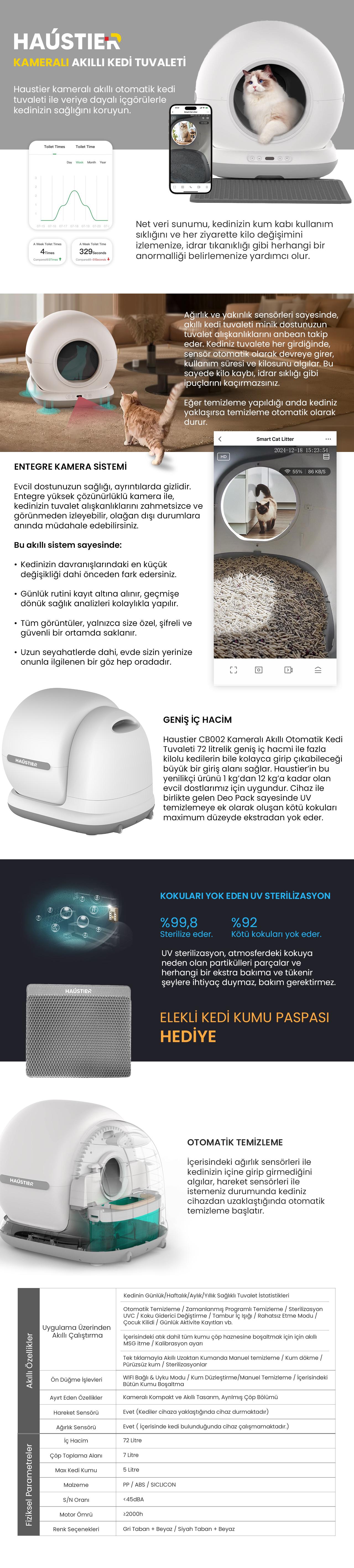 Haustier CB002 Kameralı Akıllı Otomatik Kedi Tuvaleti, APP ile Uzaktan Kontrol, 72lt Hazne, 7lt Çöp haznesi Gri