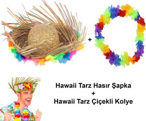 HAWAİİ TARZI SET - TROPİKAL ÇİÇEKLİ HASIR ŞAPKA VE ÇİÇEKLİ HAWAİİ KOLYEÜrün Özellikleri