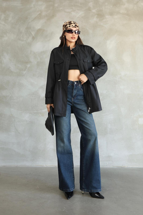 Kadın Siyah Beli Büzgülü Kısa Trençkot