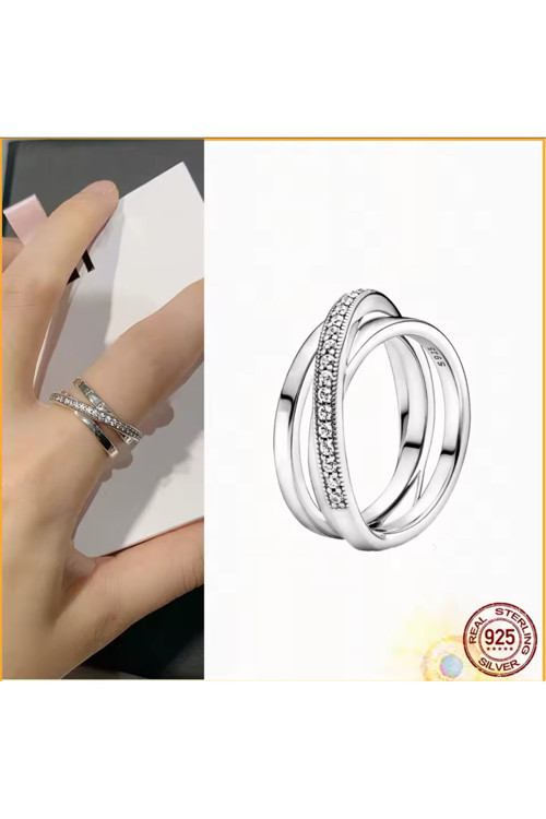 Üçlü İç İçe Geçmiş Bant Yüzük ile iddialı bir görünüm elde et. Bu 925 ayar gümüş yüzük, biri çapraz olarak diğer ikisiyle örtüşen üç şeride sahip. İç şeritlerden birinde logosu bulunuyor, diğer iç şerit parlak ve dış şeritte ise minik taşlarla çevrelenen şeffaf kübik zirkon pave dizim bulunuyor. Üç şerit de yüzük gövdesinin arkasında birleşiyor. Güneş sisteminin sarmal yapısından ilham alan bu yüzük her görünüme şıklık katıyor.