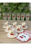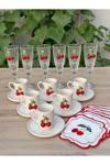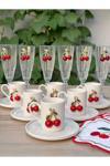 6 adet porselen kirazlı fincan, 6 adet porselen alt tabak.