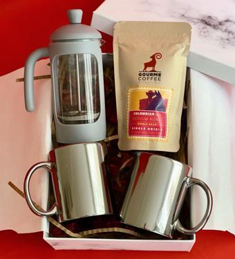 Gift Moda Çift Gümüş Kupa French Press & Filtre Kahve Sevgiliye Hediye Seti