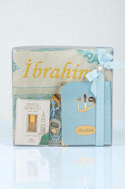 İhvan Online Hediyelik Kişiye Özel İsimli Seccade Seti - Yasin Kitabı, Tesbih, Zikirmatik, Esans - Mavi
