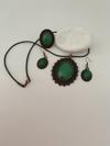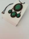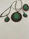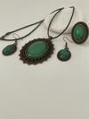 İznik el yapımı çini kolye-küpe-yüzük setinizle şıklığınızı tamamlayacaksınız. Çini set yeşil düz renktedir. Ürün antik bakır renk detaylıdır. Set içinde 1 adet kolye, 1 çift küpe, 1 adet yüzük bulunmaktadır. Ürün el yapımı çini modeldedir. Kolye sallantılı modeldir. Kolye ucunda yeşil renk detay vardır. Kolye siyah deri ipliidir. Küpenin metal kısmı da antik bakır renk detaylıdır. Yüzük antik bakır renk detaylıdır ve parmağa göre ayarlanabilir modeldir. Ürünün arka kısmı görseldeki gibidir. Ürün el yapımı çini olması sebebiyle görseldekinden biraz farklı tonda da gelebilir.