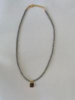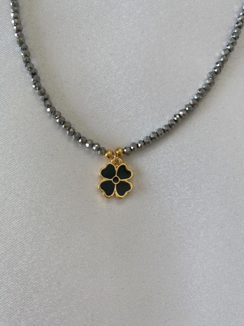 Parlak gri boncuklu dört yapraklı yonca figürlü kolyenizle şıklığınızı tamamlayacaksınız. Kolye altın renk detaylıdır. Kolye ucunda yonca yaprağı figürü vardır. Yonca yaprağı figürü siyah renk detaylıdır. Kolye aparatı istenilen uzunluğa göre ayarlanabilir. Kolyede parlak gri renkte boncuklar vardır. Yonca yaprağı figürünün iki yanında birer adet mini altın renkte boncuklar vardır.