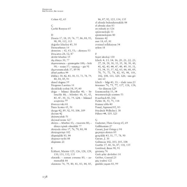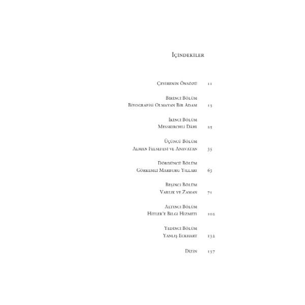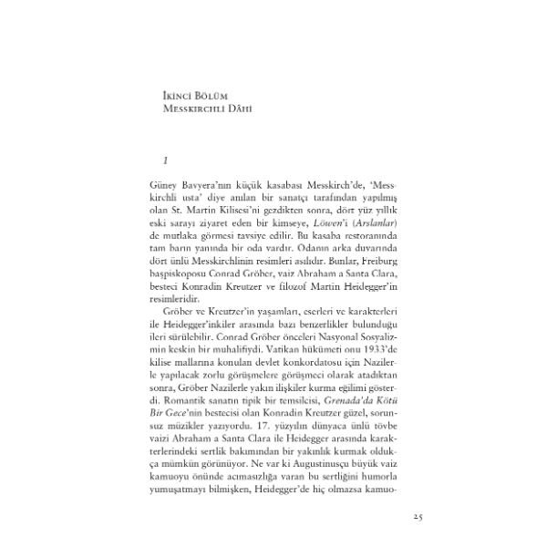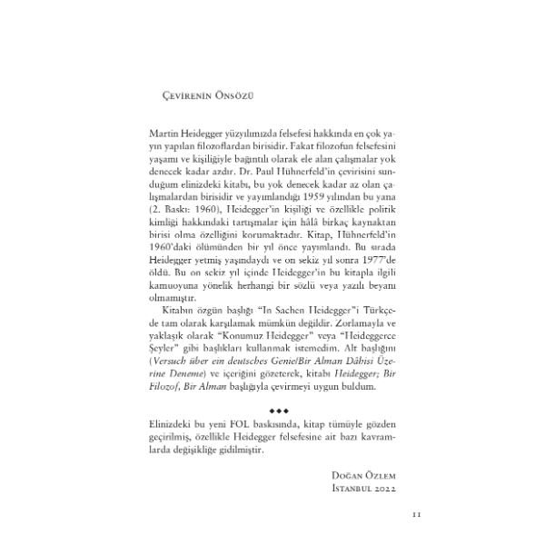Bu eşsiz kitap, neredeyse peygamber sayılmış ve bazı çevrelerce etrafına bir esrar perdesi çekilmiş bir adamı teşrih masasına yatırıyor. Hühnerfeld, büyük bir açıklık ve açıksözlülükle, filozofun kendi ‘varolana atılmışlık’ını, yani kişiliğini sergiliyor. Kitap kutsal olana saygısızlık etkisi bırakıyor ve 1930’lu yılların Heidegger’ini gözümüzün önünde bir skandal figür hâline getiriyor.