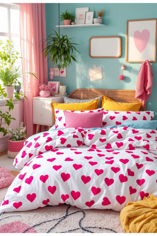 Eğlenceli pembe kalp desenleri, modern tasarımıyla yatak odanızda romantik bir dokunuş yaratır.