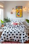 Yatak odanızı modern ve eğlenceli bir dokunuşla yenilemek ister misiniz? Helen George mikrofiber nevresim seti, şık ve eğlenceli siyah kalp deseniyle hem tarzınızı yansıtacak hem de konforu en üst düzeye çıkaracak.