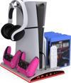 HEPU TP5-3570, PlayStation 5 kullanıcıları için geliştirilmiş çok işlevli bir soğutucu ve şarj standıdır. Konsolunuzu güvenle yerleştirirken serin tutar, kollarınızı hızlı şekilde şarj eder, oyun disklerinizi düzenli saklar ve kulaklığınız için özel askı imkanı sunar. Modern RGB ışıklı tasarımıyla hem estetik hem de işlevsel bir çözüm arayan oyuncular için idealdir.