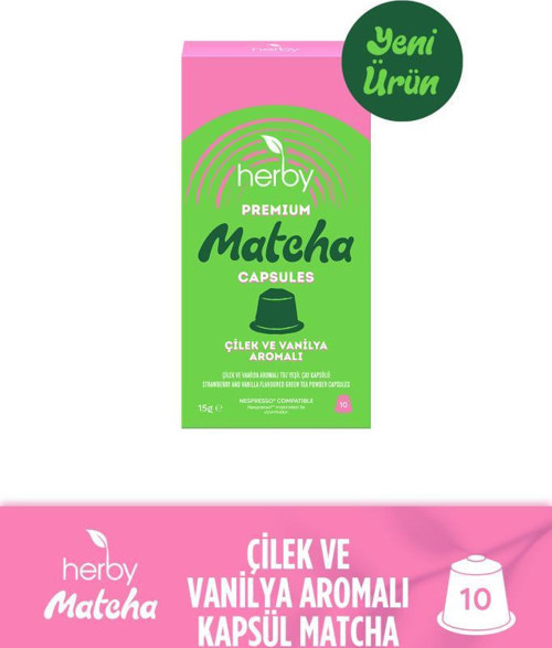Herby Matcha deneyimi artık tek dokunuşla. Çilek ve Vanilya Aromalı Herby Matcha, artık her ihtiyaç duyduğunda hızlıca hazırlayabileceğin Nespresso®* makineleriyle uyumlu kapsüllerde. Matchanın canlı karakterini çilek ve vanilyanın meyvemsi ve yumuşak lezzetiyle buluşturan bu kapsüller zengin aromasıyla matcha deneyimini bambaşka bir boyuta taşıyor. * Nespresso®, Société des Produits Nestlé S.A.’nın tescilli markasıdır. Bu ürün, Nestlé Group veya Nespresso® markasıyla ilişkili değildir.
