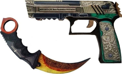 Tamamı Ahşaptır Solmayan, Dayanıklı UV Baskı Boya Oyun amaçlıdır, Keskin Değildir Tabancanın Lastik Atma özelliği vardır SET İÇERİĞİ : 1 Adet Royal Consorts P250 Tabanca 1 Adet Lore karambitee BOYUTLAR : Tabanca : Uzunluk 20 cm , Genişlik 14 cm , Kalınlık 1.6 cm karambitee : Uzunluk 20 cm , Genişlik 7 cm , Kalınlık 1 cm