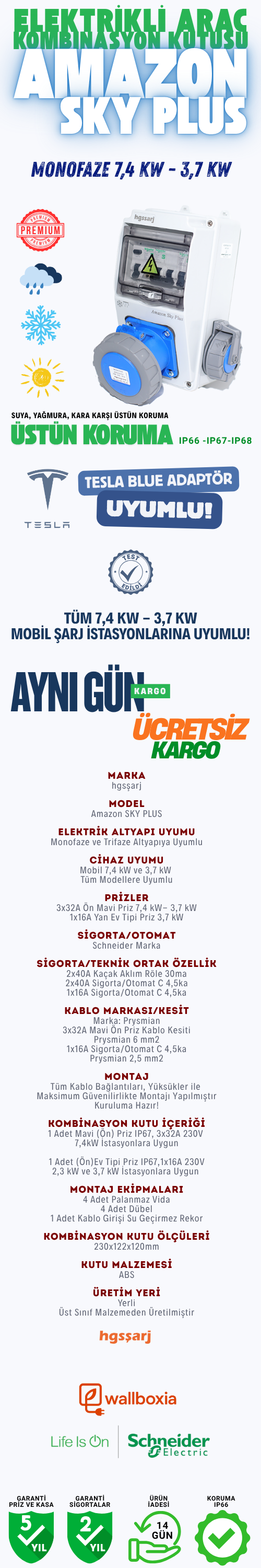 Hgsşarj Amazon Sky Plus Monofaze Elektrikli Araç Kombinasyon Kutusu Tesla Blue Adaptöre Uyumlu Schneider