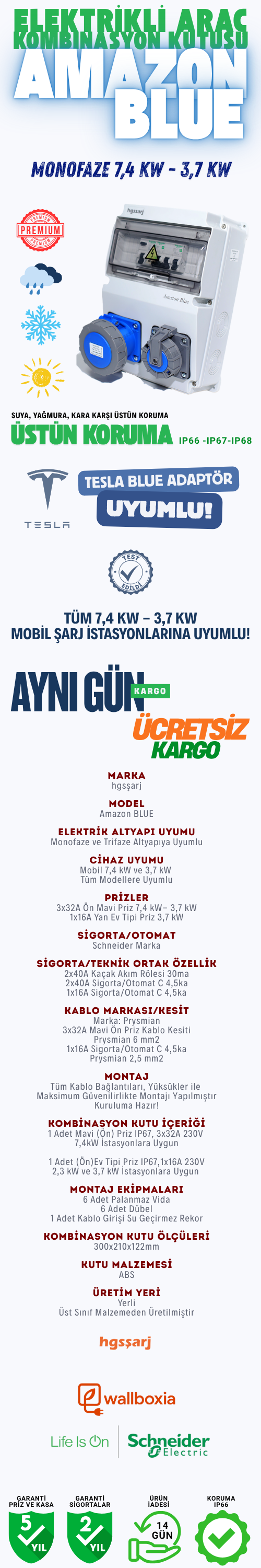 Hgsşarj Amazon Blue Monofaze Elektrikli Araç Kombinasyon Kutusu Tesla Blue Adaptöre Uyumlu Schneider