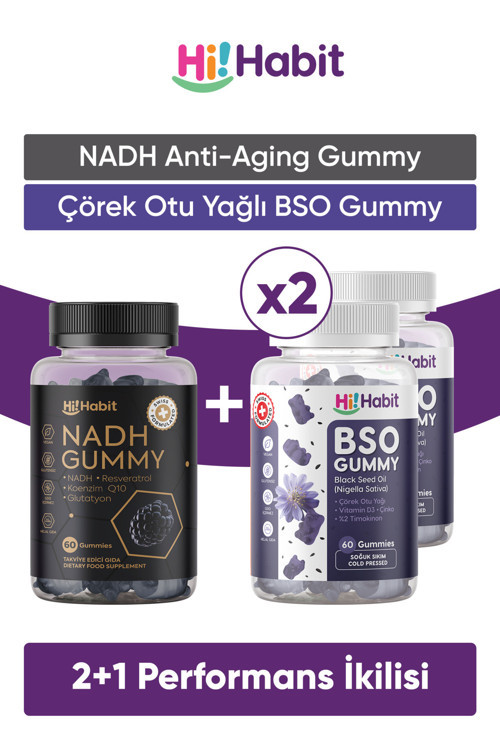 NADH AÇIKLAMA HiHabit NADH Gummy ile Enerjiyi ve Gençliği İçinizden Başlatın! Zamanın izlerini hafifletmek, hücre sağlığını desteklemek ve günlük enerjinizi yükseltmek HiHabit NADH Gummy ile artık çok daha keyifli! Her bir vegan jelibon NADH, Koenzim Q10, Resveratrol, Glutatyon, B6 ve B12 vitaminleriyle zenginleştirilmiş güçlü bir anti-aging formül sunar.