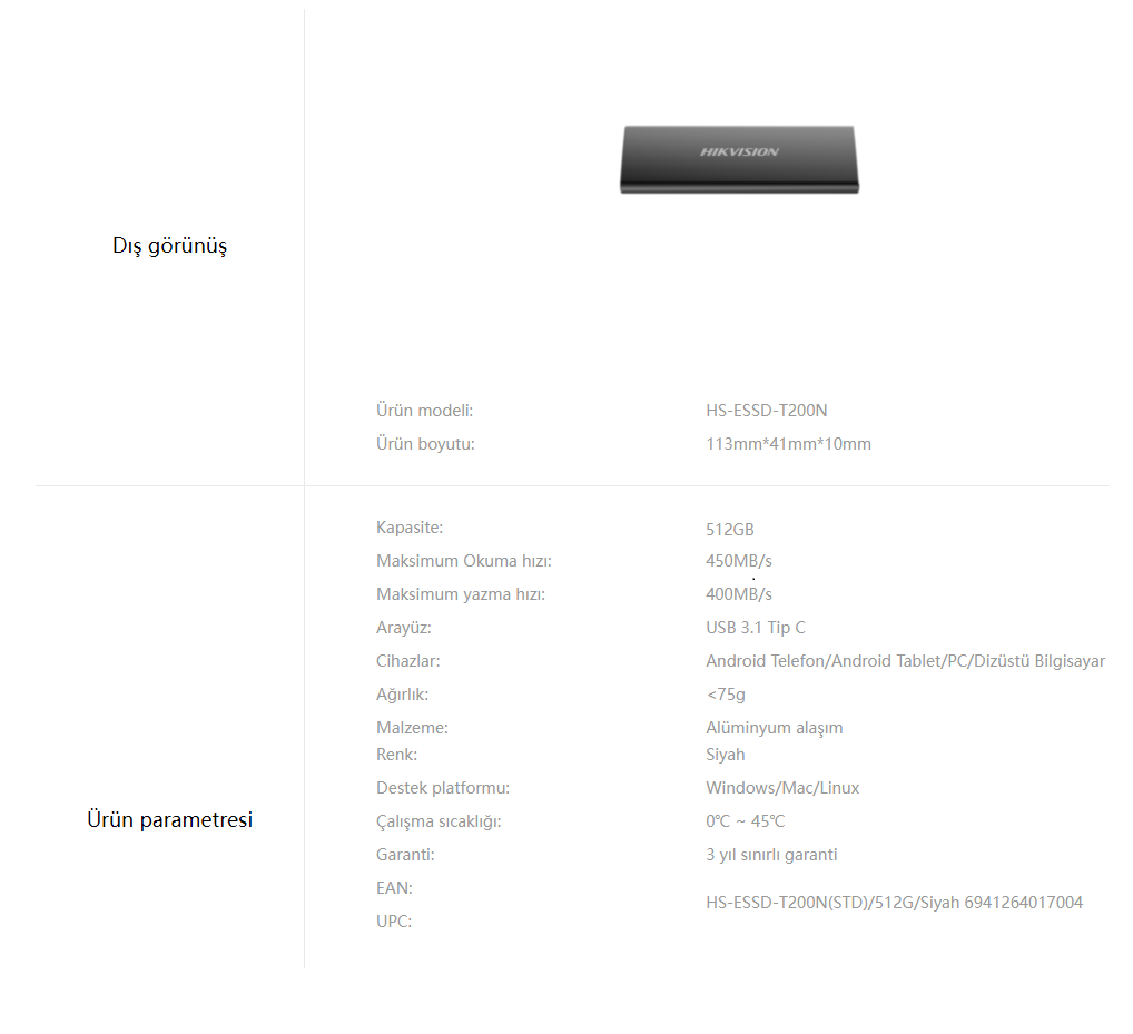 Hikvision HS-ESSD-T200N(STD)/512G 512 GB 450/400 MB/S USB 3.1 Type-C Taşınabilir SSD