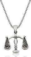 “Terazi” adaleti ve hakların dengeli şekilde dağıtılmasını sembolize eder. Adalet terazisi kolye; 925 ayar gümüşten imal edilmiştir. Gümüş üzerine oksit kaplama yapılmıştır. Oksit kaplama gümüşe eskitme görüntüsü verir. Zincir uzunluğu ortalama 55.00 cm'dr. Tüm kolyelerde olduğu gibi bu gümüş adalet terazisi kolye de tamamı el emeği ile üretilmiştir.