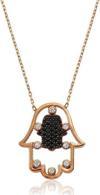Hz. Fatma'nın eli olarak bilinse de arapçada “hamse” diye anılır. Hamse, beş anlamına gelir ve bir elin parmak sayısını gösterir. Hz. Fatma bir gün mutfakta helva kavururken, eşi Hz. Ali görür ve pişen helvaya elini daldırır ancak hiç bir şey olmaz, helvayı böyle kavurmayı devam eder. O günden sonra elinin kutsallığına, gücüne adeta yenilmezliğine inanılır. Her güçlük adeta onun eliyle aşılacaktır. Bu harika tasarım Fatma eli bayan kolye modeli 925 ayar gümüş ile imal edilmiştir. Gümüş üzerine rose altın kaplama yapılmıştır. Rose altın kaplama yapılan gümüş bayan kolye modelleri parlaklığını uzun süre muhafaza eder. Kolye üzerinde bulunan siyah ve beyaz taşlar zirkondur. Gümüş Fatma eli bayan kolye modelinde olduğu gibi tüm gümüş bayan kolye modelleri el emeği ile üretilmiştir. Gümüş ve değerli taşlar nedeniyle belirtilen ortalama ürün ağırlığında ± %10 sapma olabilmektedir.
