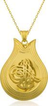 Tuğra, Osmanlı sultanlarının imzası anlamına gelir. Her tuğra; ona ait olan padişahın ismini, varlığını, hükümdarlığını ifade eder. Tuğra sembolü her padişaha göre farklı olmak üzere birçok şekilde günümüze ulaşmıştır. Tuğra Osmanlının her döneminde korunmuş, önemini hiç kaybetmemiştir. Ve zamanla hat sanatımızda da önemli bir yere sahip olup, günümüzde hattatlar tarafından sanatsal olarak yaşatılmaktadır. Bu mükemmel kolyeyi; doğum günü hediyesi, sevgililer günü hediyesi veya annelere hediye olarak özel günlerde tercih edebilirsiniz. Sarı tuğra bayan kolye 925 ayar gümüşten imal edilmiştir. Gümüş üzerine altın kaplama yapılmıştır. Altın kaplama yapılan kolyeler parlaklığını uzun süre muhafaza eder, gümüş rengini sarı renge dönüştürür ve oksitlenmeyi geciktirir. Üzerinde bulunan beyaz taşlar zirkondur. Tüm gümüş kolyelerde olduğu gibi gümüş sarı tuğra kolye de el emeği ile üretilmiştir. Gümüş ve değerli taşlar nedeniyle belirtilen ürün ağırlığında ± %10 sapma olabilmektedir.