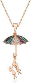 Yağmur altında şemsiyeli aşıklardan esinlenilerek hazırlanmış olan bu özgün tasarımlı gümüş kolye severek kullanabileceğiniz ya da sevdiklerinize yılbaşı, sevgililer günü, doğum günü gibi özel günlerde hediye edebileceğiniz anlamlı bir hediyedir. Kolye 925 ayar gümüşten imal edilmiştir. Gümüş üzerine rose altın kaplama yapılmıştır. Rose altın kaplama yapılan gümüş bayan kolyeler parlaklığını uzun süre muhafaza eder, gümüşü pembe renge dönüştürür ve oksitlenmeyi geciktirir. Kolye üzerinde bulunan taşlar zirkon'dur. Gümüş olan zincir boyu ortalama 45 cm'dir. Tüm gümüş kolyelerde olduğu gibi gümüş kelebek çemberi kolye de el emeği ile üretilmiştir. Gümüş ve değerli taşlar nedeniyle belirtilen ürün ağırlığında ± %10 sapma olabilmektedir.