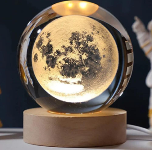 Dekoratif Dolunay Tasarımlı Ahşap altlıklı Işıklı Cam Küre Büyük Boy 8cm