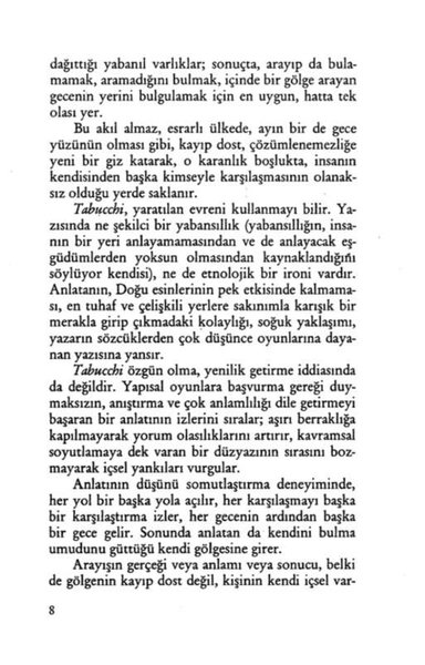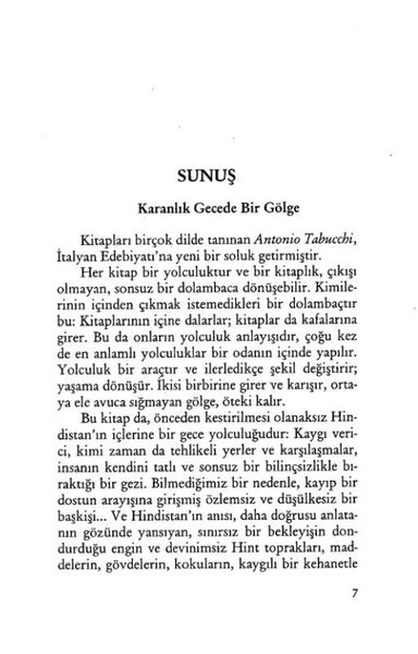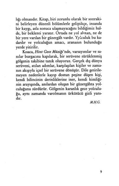 Kitapları pek çok dile çevrilen Antonio Tabucchi, son yılların İtalyan edebiyatına yeni bir soluk getiren bir yazar. Birkaç kitabıyla ülkemizde de tanınan bu ünlü yazarın Hint Gece Müziği adlı bu kısa romanının yeni basımını uzun bir aradan sonra okurla buluşturmak istedik. Hint Gece Müziği, neler sunacağı bilinmeyen Hindistan'ın içlerine bir gece yolculuğu. Varsayımlar ve sanılar burgacına kapılarak serüvene sürüklenen bir gölgenin izini süren anlatıcının, tehlikeli yerler ve karşılaşmalarla dolu, tatlı ve sınırsız bir bilinçsizlikle kendini bıraktığı bir gezi, bir arayış. Bitimsiz bir bekleyişle yüklü, engin ve devinimsiz Hint toprakları ve bu topraklarda, gölgelerin arasında kaybolmuş dostunu arayan bir adam. Yerel renk basitliğine düşmeden çizilmiş gerçekdışı bir harita ve her biri farklı bir insan boyutu olan on iki bölümlük bir coğrafyada, kayıp dostun peşinde geçirilen günler, aslında anlatıcının kendi kimliğinin, gölgesinin, içsel gerçeğinin arayışı. Gölgenin karanlık gece yolculuğu, aynı zamanda varolmanın ürkütücü gizli yanı. Doğu esinlerinin fazlaca etkisinde kalmadan, en tuhaf, en gizemli yerlere sakınımla karışık bir merakla girip çıkabilen anlatıcı rolündeki yazar, bu serüveni, mesafeli yaklaşımıyla, sözcüklerden çok, düşünce oyunlarına dayana bir anlatımla yansıtıyor. Antonio Tabucchi, kitabının başında 'Bir kitap yalnızca bir uykusuzluk değil, aynı zamanda da bir yolculuktur.' diyor. 'Uykusuzluk kitabı yazana, yolculuk da gezene aittir.' O zaman: İyi yolculuklar!
