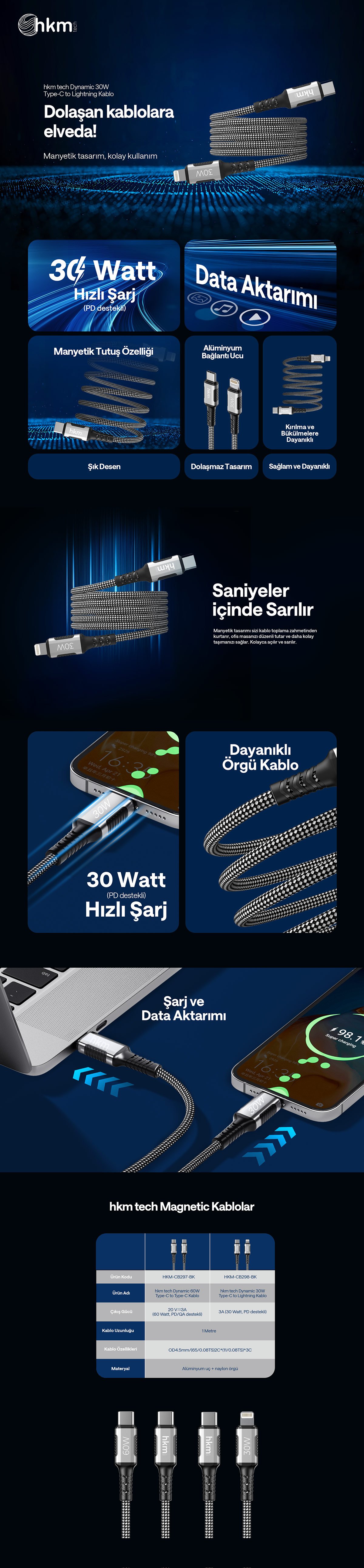 hkm tech DYNAMIC 30W hızlı şarj, Mıknatıslı, Type-C to Lightning Şarj ve Data Aktarım Kablosu, 1 metre, Siyah