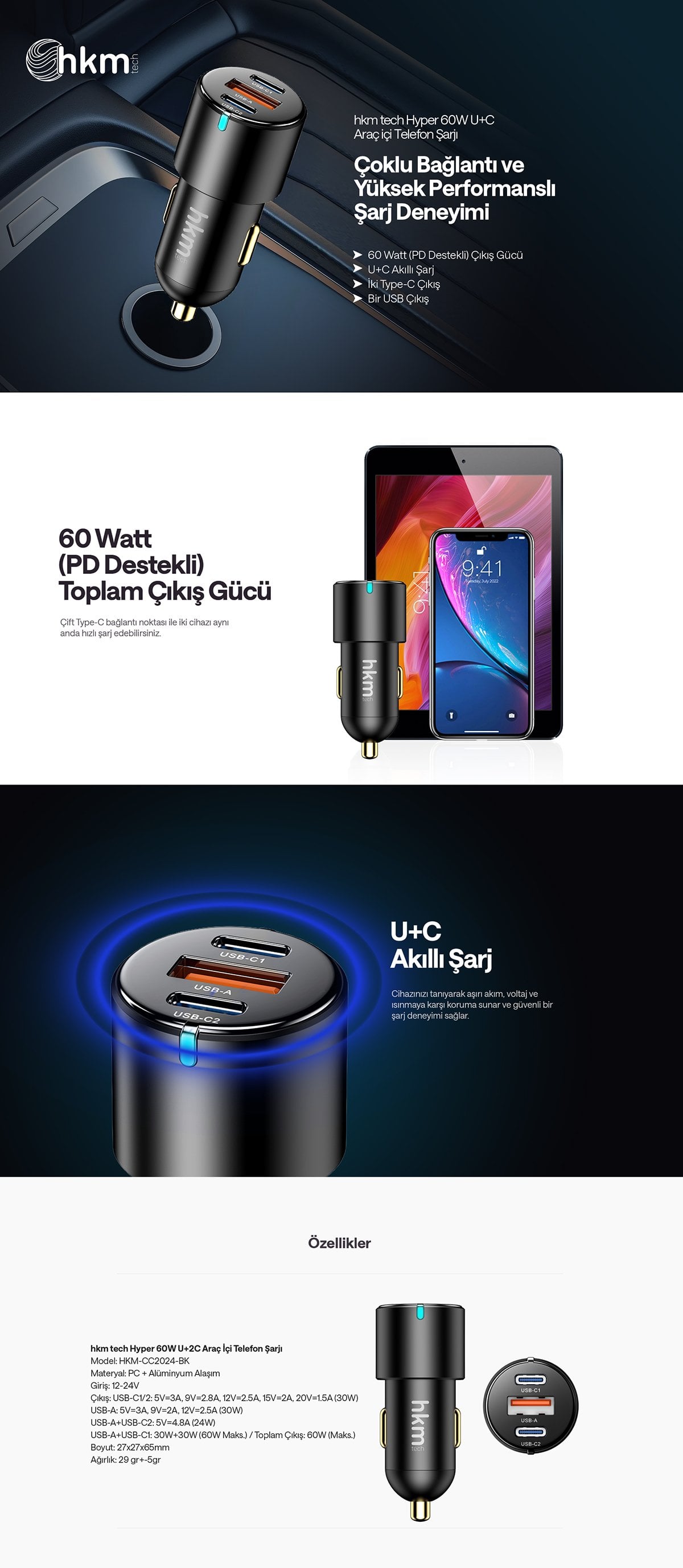 hkm tech HYPER 60W Hızlı Şarj Destekli, 3 girişli (2xType-C 1xUSB) Araç İçi Çakmaklık Şarj Aleti