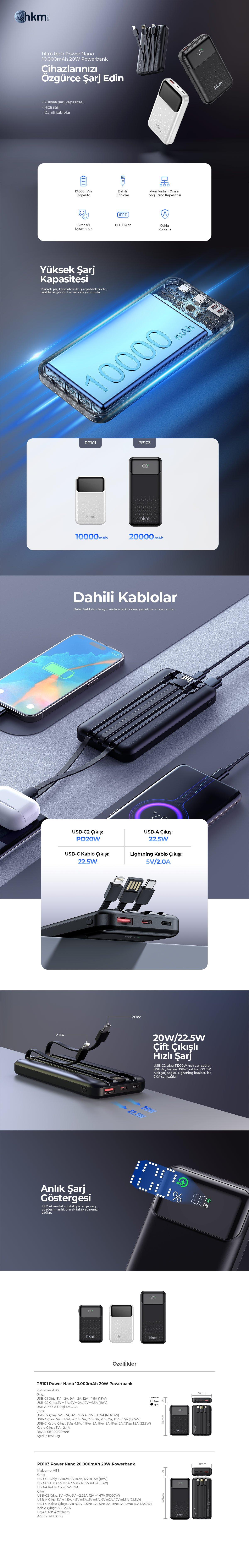 hkm tech POWER NANO 10.000 mAh 20W, PD 20W hızlı şarj destekli, Type-C ve Lightning Kablolu Powerbank