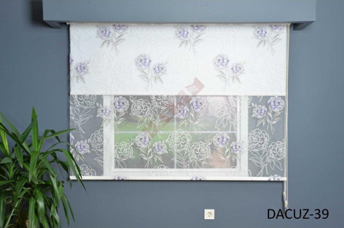 Çift Mekanizmalı Tül Stor Perde Dacuz-39 Mor Gül Desen Alüminyum Kasalı Etekli Veya Eteksiz
