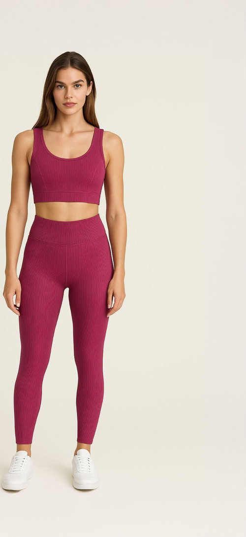 Mürdüm renkte yüksek bel toparlayıcı tam boy ripli spor tayt, vücudu sıkıca sararak maksimum konfor ve destek sağlar.