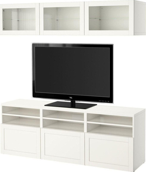 Tv ünitesi, beyaz-şeffaf cam, 180x42x192 cm, HANVIKEN/SINDVIK, çıt çıt raylı