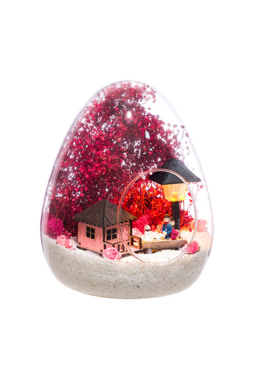 beyaz kum, kurutulmuşbitkiler, şoklanmış yosunlar, yapay güller, bir adet pembe ahşap ev görseli, biradet ışığı iki farklı renkte yanan led sokak lambası görseli ve bir adet banktaköpekleriyle oturan aşıkları simgeleyen obje ile kurgulanarak tamamlanmıştır. Ev ve ofis ortamlarınıntamamında sergilenebilir teraryumun içinde, kurutulmuş ve şoklanmış bitkilerbulunduğundan hava alması önemlidir. Açık olan kısmının kapatılmaması veya büfevb. kapalı alanlara konulmaması gereklidir. Özellikle her ortamda yıllarca,zevkle izlenebilecek özel bir teraryumdur. Yaklaşık Ölçüleri