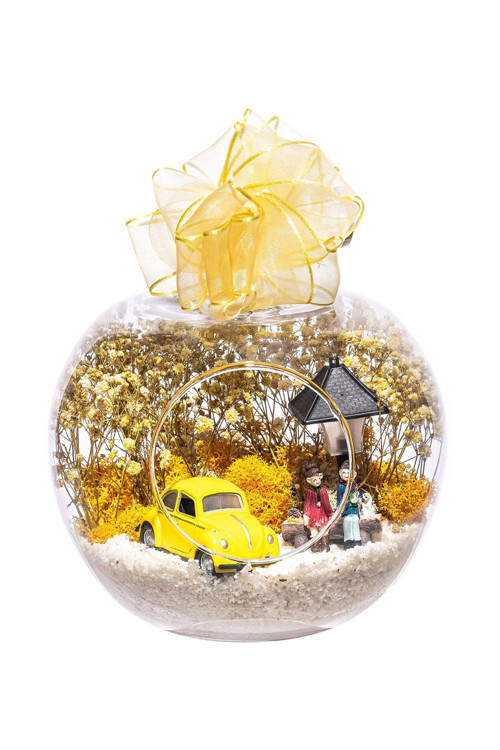 beyaz kum, şoklanmış yosunlar,kurutulmuş bitkiler, bir adet vosvosaraba, bir adet köpekleriyle yan yana oturan mutlu çift, bir adet işığı 2 farklı renkte yanan lamba veüzerinde kurdelasıyla sizler için tasarlanmıştır. Ev ve ofis ortamlarınıntamamında sergilenebilir teraryumun içinde canlı bitki bulunmadığından,herhangi bir bakıma ihtiyacı yoktur. Özellikle her ortamda yıllarca, zevkleizlenebilecek özel bir teraryumdur. Yaklaşık Ölçüleri