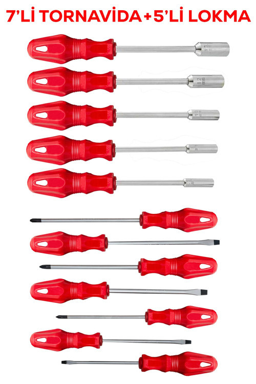 7 parca duz ve yildiz tornavida 5 parca farkli numarada lokma tornavida seti.; C-45 sertlestirilmis celik uc,ergonomik sap.; %100 yerli uretim urunler.; Kutu içeriği:6-7-8-10-13mm lokma tornavida ve 7 parça düz,yıldız tornavida takımı.