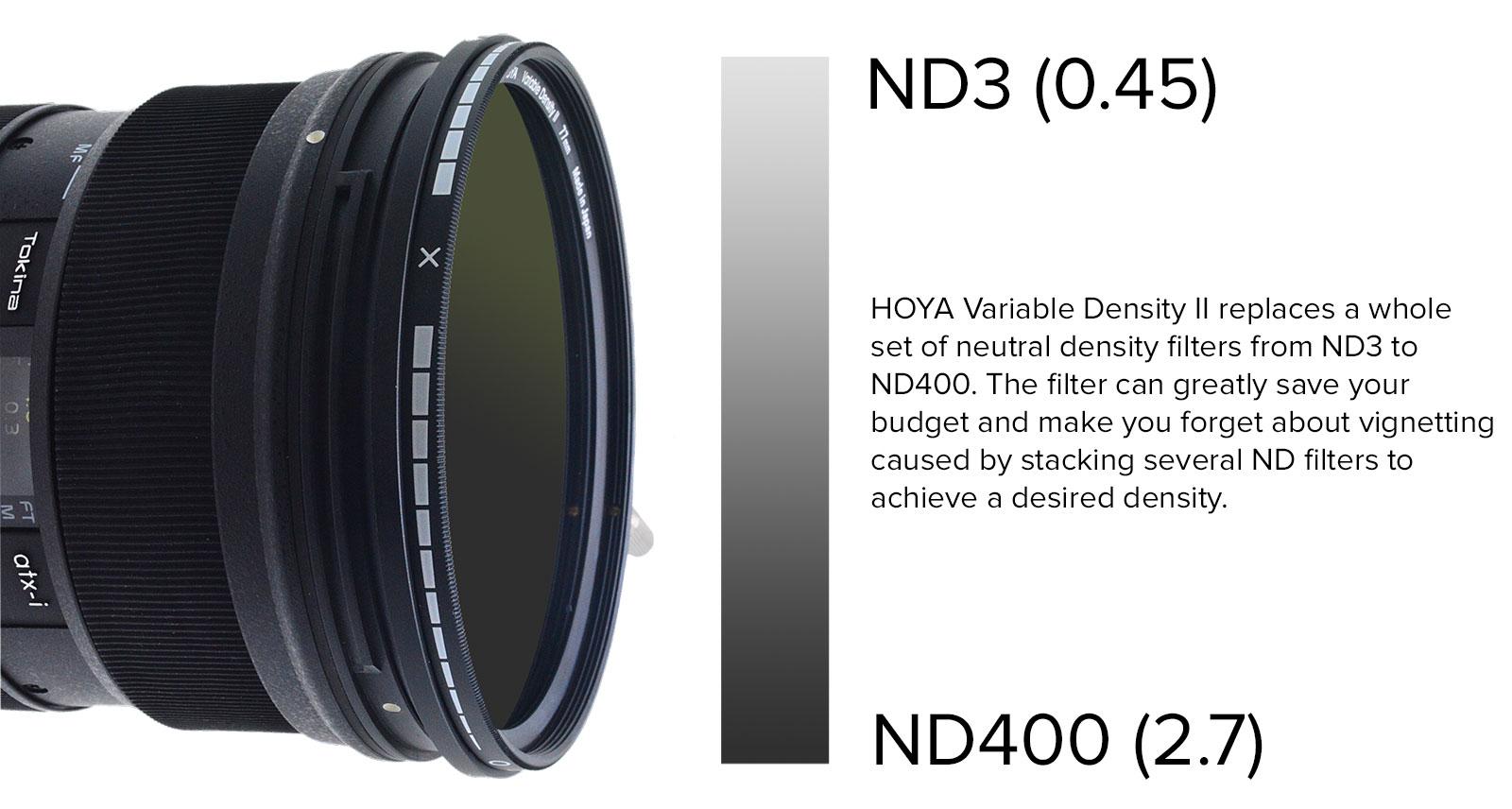 HOYA Değişken Yoğunluk II, 1,5 ila 9 f-stop (ND3-400) arasında bir ND aralığına sahip, yoğunluğu ayarlanabilir bir filtredir.