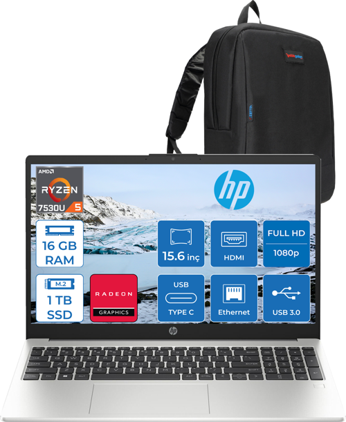 HP 255 G10 Amd Ryzen 5 7530U 16GB 1tb SSD Amd Radeon Grafik Freedos 15.6" Taşınabilir Bilgisayar 9G1G0ETF08 + Zetta Çanta