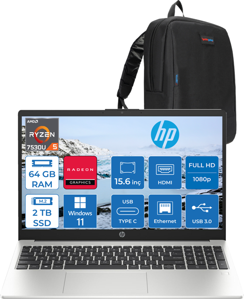 Hp 255 G10 Amd Ryzen 5 7530U 64GB 2tb SSD Amd Radeon Grafik Windows 11 Home 15.6" Taşınabilir Bilgisayar 9G1G0ETH34 + Zetta Çanta