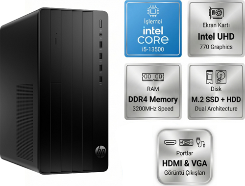 Gücünü 13. Nesil Intel Core i5-13500 işlemciden alan, 14 Çekirdekli mimarisiyle en zorlu işlerin altından kalkın. Intel UHD 770 grafik birimi ve zengin bağlantı donanımıyla ofisinizdeki verimliliği zirveye taşıyın.