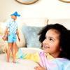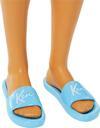 --Ken® bebeğin üzerinde mavi ve beyaz renkli karo desenli bir gömlek ve uyumlu, açık mavi bir deniz şortu vardır. Parlak mavi terliklerinde Ken® logosu bulunur.