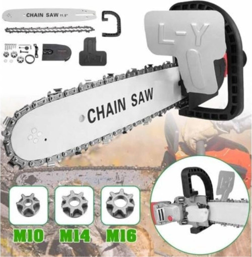 Aparat, avuç taşlama makinesini, zincirli testereye çevirmektedir.