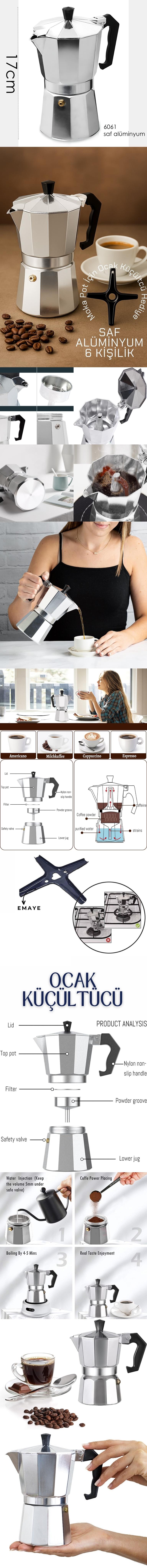 6061 saf alüminyum gövdeden üretilen bu Moka Pot, hafif ve dayanıklı yapısıyla uzun ömürlü kullanım sunar.